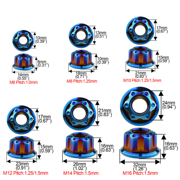 材質:6AL / 4V(TC4)チタン合金、グレード5 M6サイズ:ナット径:14mm、高さ:6mm;ピッチ:1.0mm M8サイズ:ナット径:18mm、高さ:10mm; ピッチ:1.25mm M10サイズ:ナット径:21mm、高さ:14.5mm; ピッチ:1.25mm M12サイズ:ナット径:25mm、高さ:13.7mm; ピッチ:1.25mm M14サイズ:ナット径26mm:高さ:15.25mm; ピッチ:1.5mm パッケージ内容:チタンナット1個のみ